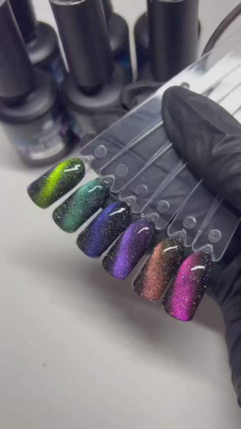 Our Pro Impressions Cosmic Cat Eye Gel Polishes are high pigmented 2 tone colours with reflective iridescent highlights.