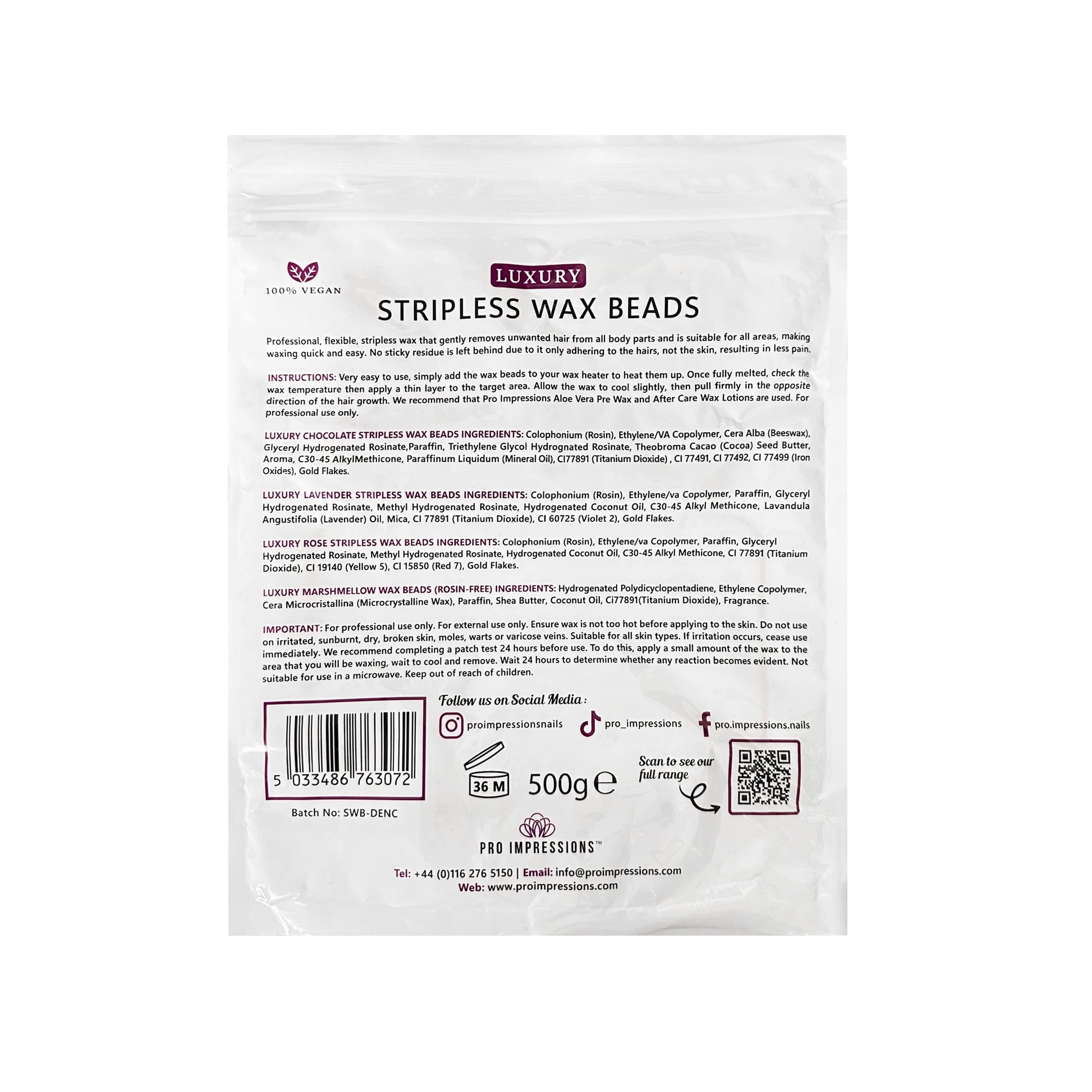 Very easy to use, simply add the wax beads to your wax heater to heat them up. Once fully melts, check the wax temperature then apply a thin layer to the target area. Allow the wax to cool slightly, then pull firmly in the opposite direction of the hair growth, we recommend that Pro Impressions Aloe Vera Pre Wax and After Care Wax Lotions are used before and after the treatment. For professional use only.